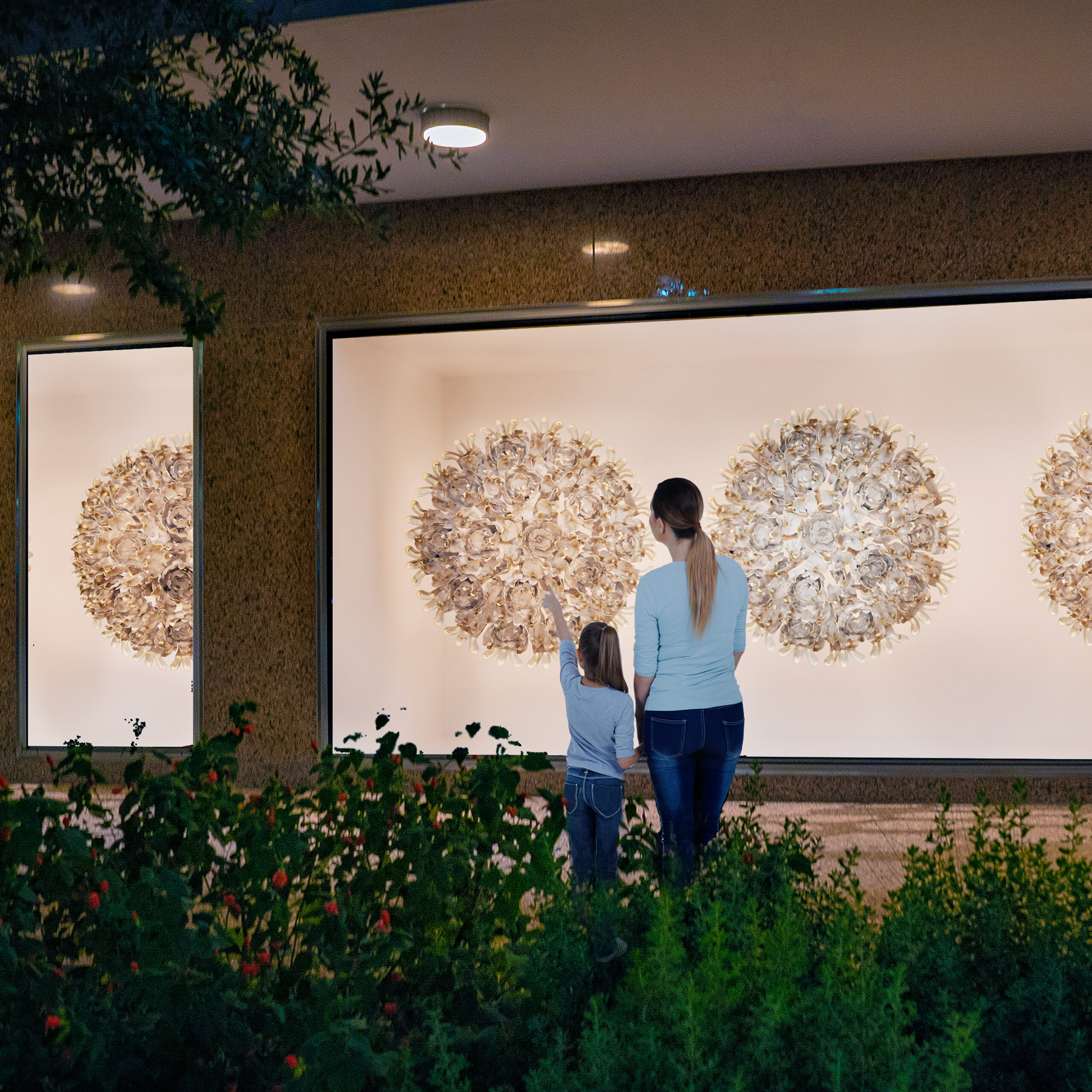 Installed within a large window, their “home” is framed by a green-painted mural reminiscent of urban vegetation. A smaller painted window offers a visual companion, while a suspended mobile—evoking the clouds above the city—adds a playful, dreamlike presence. By night, projection mapping animates the sculptures, transforming them into illuminated vessels of memory and imagination.
