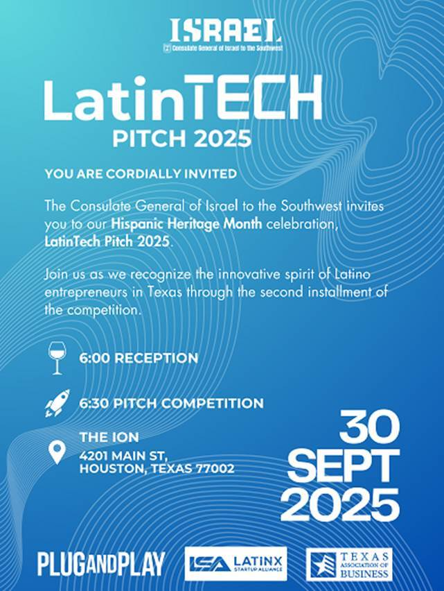 Register Here: https://www.latintechpitch.com/event-details/latintech-pitch-2025 The Consulate General of Israel to the Southwest, together with their partners Latinx Startup Alliance, Texas Association of Business, and Plug and Play, are thrilled to invite you to a special Hispanic Heritage Month celebration of innovation, creativity, and entrepreneurship — the 3rd edition of LatinTech Pitch! This year’s finalists represent the bold spirit and ingenuity […]